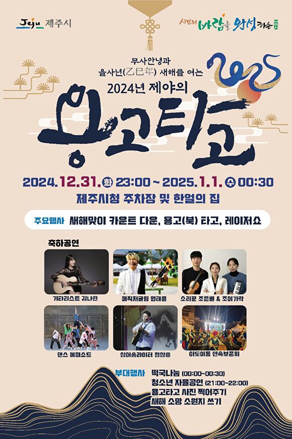 [아이뉴스24 박태진 기자] 제주특별자치도 제주시는 2024년을 마무리하고 희망의 을사년(乙巳年) 새해를 맞아, 제주시민의 무사 안녕을 기원하는 제야의 용고타고 행사를 오는 31일 밤 11시 제주시청에서 개최한다.