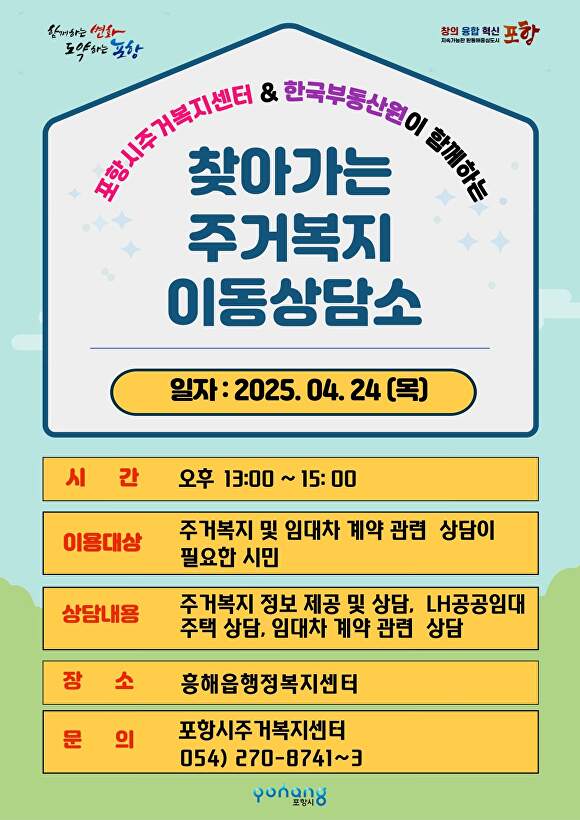 이번 이동상담소는 포항시 주거복지센터와 한국부동산원 포항지사가 함께 운영하며, 주거 문제로 어려움을 겪는 시민들을 직접 찾아간다.