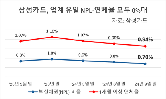 [아이뉴스24 권서아 기자] 삼성카드의 건전성 관리가 빛을 발하고 있다. 연체율과 부실채권(NPL) 비율이 올해 9월 기준으로 모두 0%대다. 업계에서 유일하다.