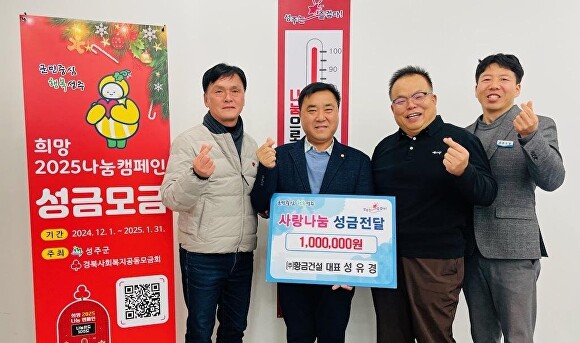 배해석 성주읍장은 “지역복지 활성화를 위해 꾸준히 힘써주시는 성유경 대표님께 감사를 표한다”라며 “매서운 한파로 더욱 힘든 겨울을 보내는 취약계층에게 따뜻한 마음을 잘 전달하겠다”고 말했다.