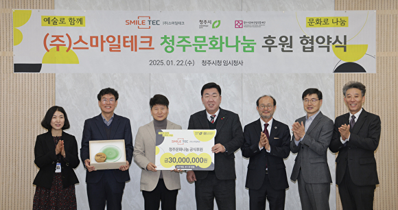청주시문화산업진흥재단(대표이사 변광섭)은 22일 청주시청 임시청사에서 스마일테크가 지역 문화예술 발전을 위한 청주문화나눔에 올해부터 3년간 1000만원씩 3000만원을 기부하기로 약정했다고 밝혔다.