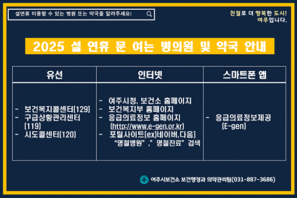 안선숙 여주시보건소 보건행정과장은 “시민 모두가 건강하고 안전한 설 연휴를 보낼 수 있도록 응급의료체계 유지에 적극 대응하겠다”고 전했다.