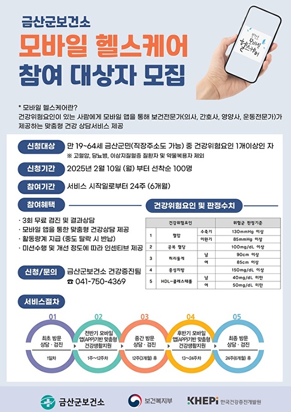 대상자는 만 19세 이상 65세 미만인 금산군민과 금산군 소재 직장인으로 스마트폰을 활용할 수 있어야 하고 혈압‧공복혈당‧허리둘레·중성지방·고밀도(HDL) 콜레스테롤 등 건강위험 요인을 1개 이상 보유해야 한다.