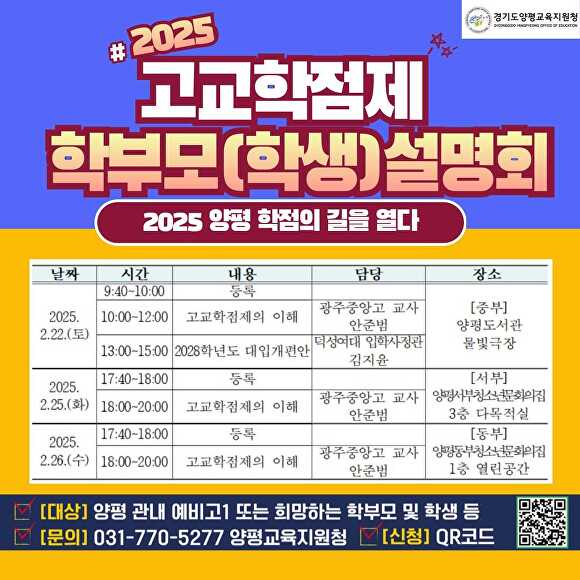 설명회 대상은 양평군 2025학년도 예비고1·희망하는 학부모, 학생이며 △고교학점제 교육과정, 공동교육과정, 학교 밖 교육 △고교학점제 학점이수 인정기준 및 최소 성취수준 보장지도 △고등학교 성취평가제 △2028학년도 대입개편안 등에 관한 내용이다.