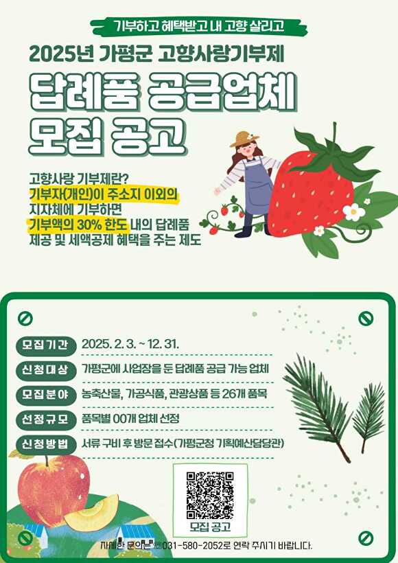 [아이뉴스24 이윤 기자] 경기도 가평군이 고향사랑기부제 답례품 공급업체를 연말까지 모집한다. 추가 공급업체 모집은 답례품 품목을 다양화하고 기부자의 선택 폭을 확대하기 위한 것으로, 오는 12월 31일까지 상시 신청하면 된다.