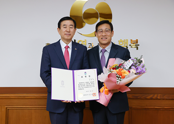13일 충주시에 따르면 조길형 시장은 이날 시청에서 문대식 총재에게 모범 충북도민 표창장을 수여했다.