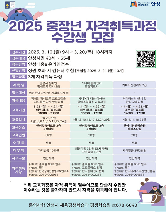 이번 자격취득 과정은 안성시민 중 40세부터 65세까지를 대상으로, 총 세 가지 과정이 개설된다.