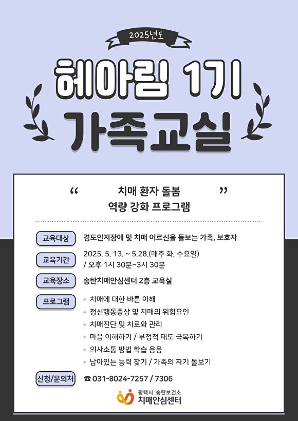 송탄보건소 관계자는 “치매에 대한 올바른 지식과 돌봄 교육을 통해 서로를 이해하는 계기가 되기를 바란다”며 “보호자의 부양 부담 경감과 치매 환자의 삶의 질 향상을 위해 노력하겠다”고 말했다.