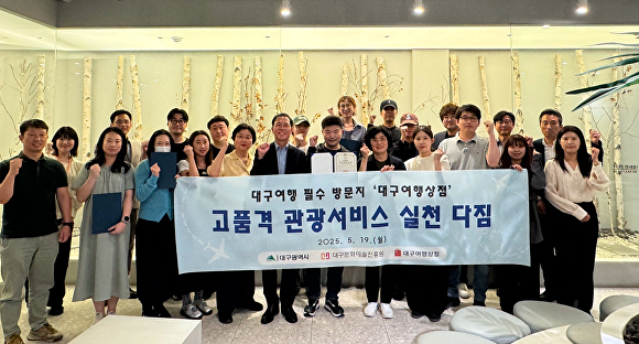 [아이뉴스24 이창재 기자] 대구광역시와 대구문화예술진흥원 관광본부(원장 박순태)는 지난 19일 중구 동성로 ‘한끼플러스 동성로점’에서 ‘고객 서비스 품질 향상 실천 서약식’을 개최하고, 관광객을 위한 고품격 서비스 제공에 나설 것을 다짐했다.