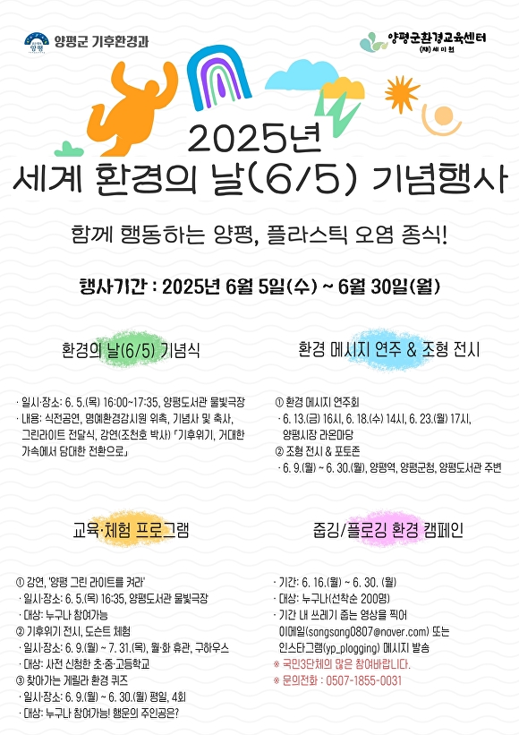 [아이뉴스24 이윤 기자] 경기도 양평군은 제53주년 환경의 날을 맞아 환경보전의 중요성을 널리 알리고, 군민과 함께하는 환경 실천문화를 조성하기 위해 6월 한 달간 ‘환경의 달 기념행사’를 추진한다.