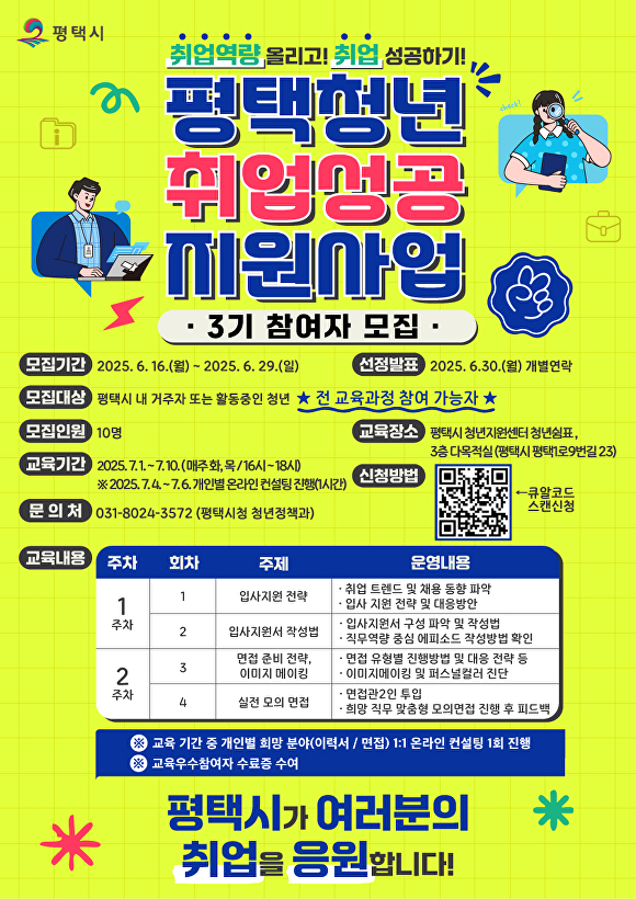 [아이뉴스24 최화철 기자] 경기도 평택시는 오는 16일부터 29일까지 ‘평택청년 취업 성공지원 사업’ 3기 교육생을 모집한다고 13일 밝혔다.