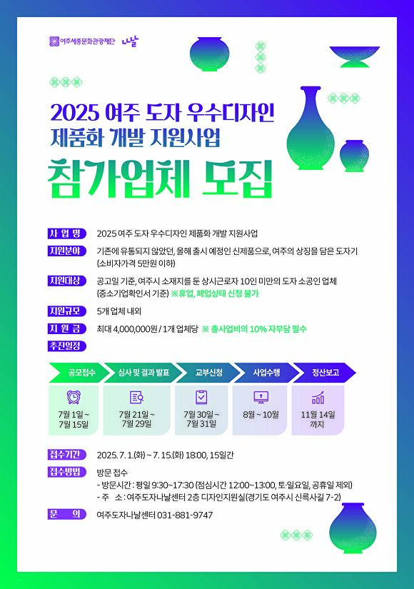 [아이뉴스24 임정규 기자] 경기도 여주세종문화관광재단은 '여주 도자 우수디자인 제품화 개발 지원사업'에 참여할 업체를 모집한다고 16일 밝혔다.