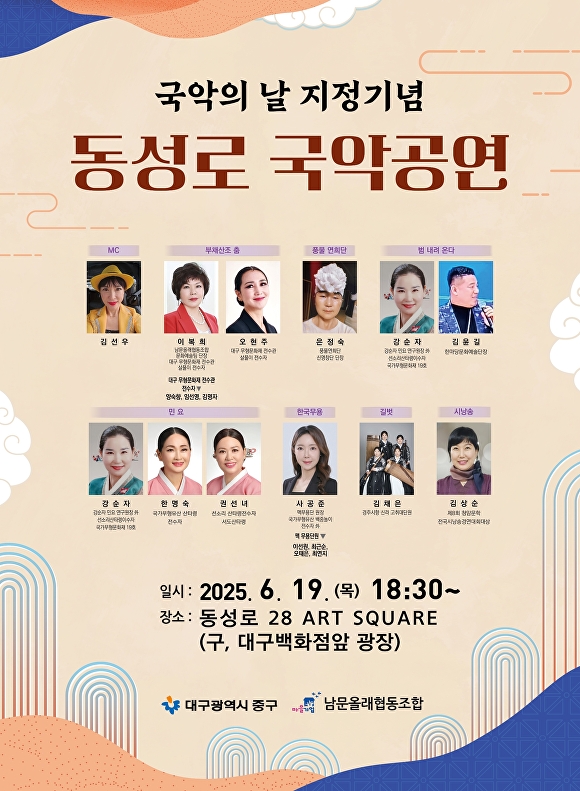 [아이뉴스24 이창재 기자] 대구 중구(구청장 류규하)는 오는 19일 오후 6시 30분, 동성로 28아트스퀘어(구 대구백화점 앞 광장)에서 ‘국악의 날’을 기념한 ‘동성로 국악 공연’을 개최한다고 17일 밝혔다.