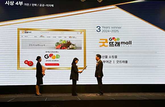 [아이뉴스24 정다운 기자] 충남 부여군은 공식 농특산물 온라인 쇼핑몰인 ‘굿뜨래몰’이 ‘2025년 국가서비스대상’ 농특산물 쇼핑몰 부문에서 3년 연속 대상을 수상했다고 27일 밝혔다.