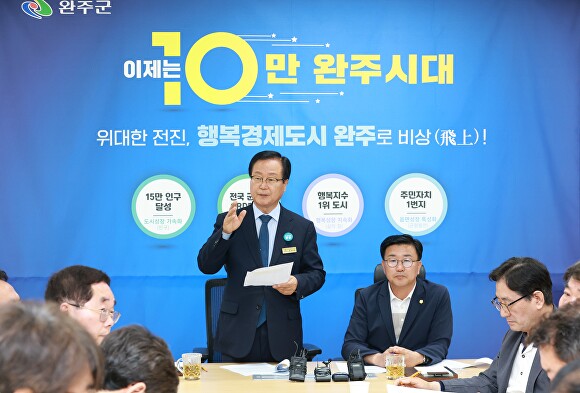 유 군수는 이날 언론 브리핑을 통해 “신규 주거단지 조성 등 정주여건 개선, 적극적인 기업 유치를 통한 양질의 일자리 창출, 아이 낳고 양육하기 좋은 환경 조성 등을 통해 10만 완주시대를 개막했다”며 “이러한 기세를 몰아 올해 안에 전북 4대 도시로 도약하겠다”고 밝혔다.