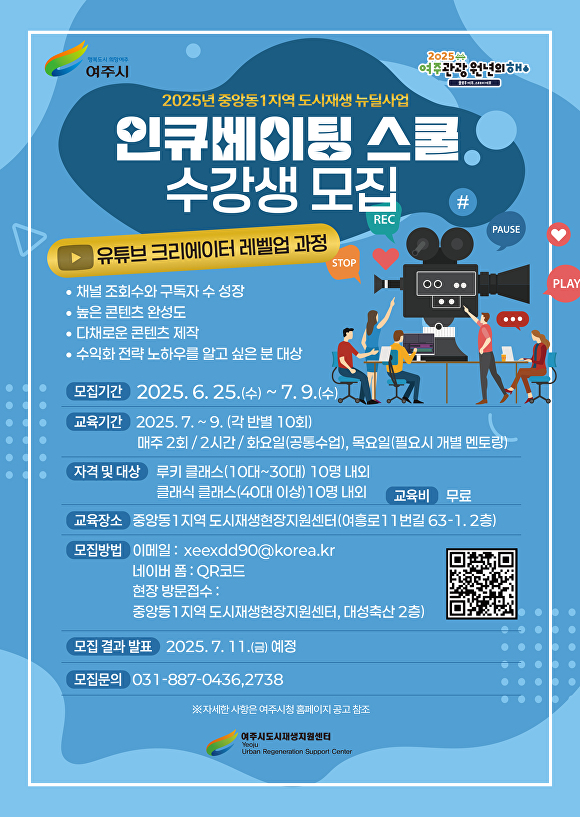 [아이뉴스24 임정규 기자] 경기도 여주시가 중앙동1지역 도시재생 뉴딜사업의 일환으로 '인큐베이팅 스쿨-유튜브 크리에이터 레벨업 과정' 수강생을 모집한다고 1일 밝혔다.
