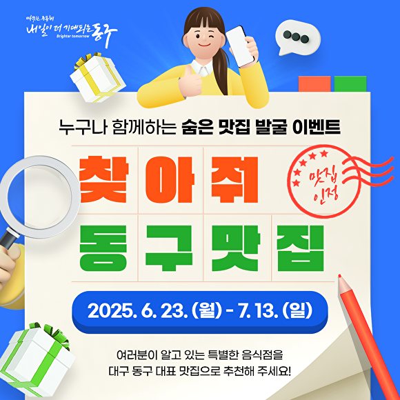 윤석준 동구청장은 “지역민의 생생한 추천을 통해 숨은 맛집이 널리 알려질 수 있기를 기대한다”며 “동구 맛집 홍보와 지역 상권 활성화에 도움이 되길 바란다”고 말했다.