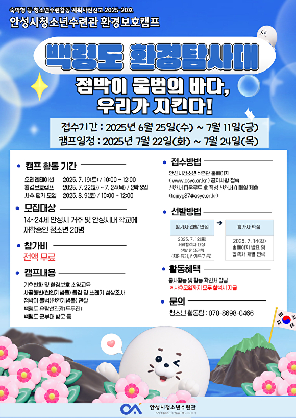 [아이뉴스24 임정규 기자] 경기도 안성시청소년수련관은 오는 11일까지 안성시 거주 중이거나 관내 학교에 재학 중인 14세부터 24세까지 청소년을 대상으로 환경보호캠프 ‘백령도 환경탐사대’ 참가자를 모집한다고 7일 밝혔다.