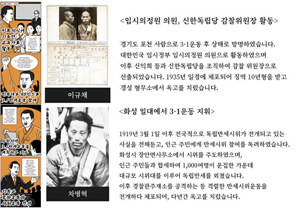 이번에 공개된 인물을 구체적으로 살펴보면 이규채 독립운동가는 포천 출신으로 3·1운동 후 상해로 망명해 대한민국 임시정부 임시의정원 의원으로 활동했다. 이후 신익희 등과 신한독립당을 조직해 감찰위원장으로 선출됐다. 1935년 일경에게 체포돼 경성 형무소에서 옥고를 치렀다.