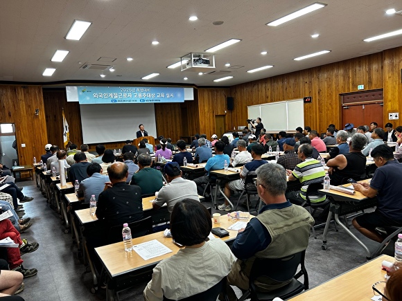 이번 교육은 지속적으로 발효되는 폭염 경보에 대비해 외국인 계절근로자의 온열질환을 예방하고 안전사고를 미연에 방지하기 위해 마련됐다.