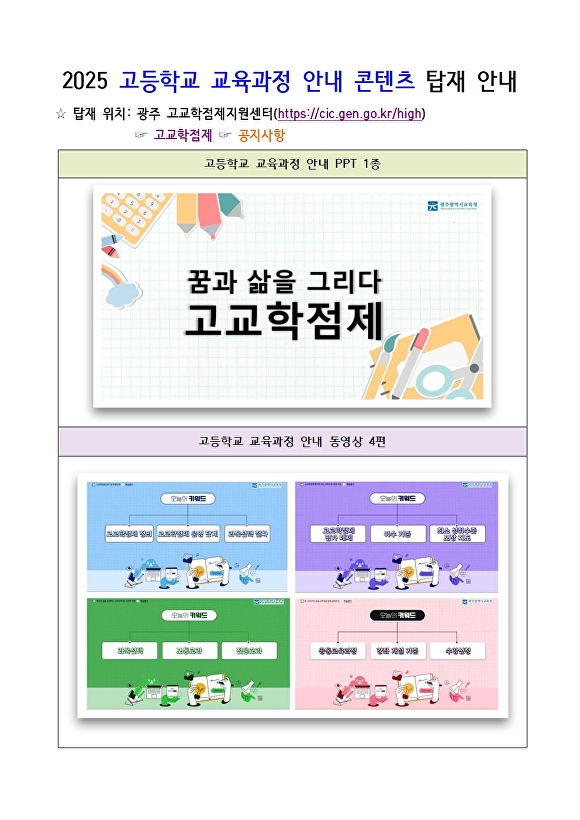 [아이뉴스24 한봉수 기자] 광주광역시교육청이 고교학점제 등 달라진 고등학교 교육과정에 대한 이해를 높이기 위해 안내 콘텐츠를 개발했다고 밝혔다.