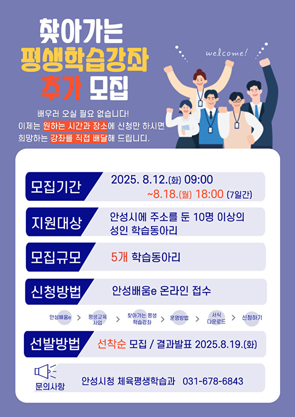 [아이뉴스24 임정규 기자] 경기도 안성시는 시민이 원하는 시간과 장소로 강사가 찾아가는 맞춤형 평생학습 서비스인 '2025년 하반기 찾아가는 평생학습강좌'에 참여할 학습동아리 5개를 추가 모집한다고 11일 밝혔다.