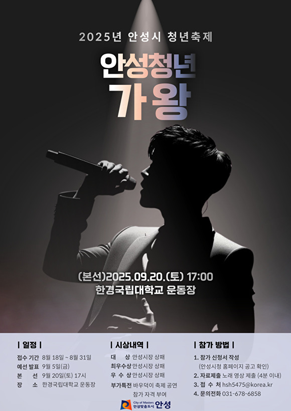 [아이뉴스24 임정규 기자] 경기도 안성시는 다음달 20일 한경국립대학교 운동장에서 열리는 ‘2025년 안성시 청년축제’의 메인 프로그램 ‘안성청년가왕’ 참가자를 모집한다.