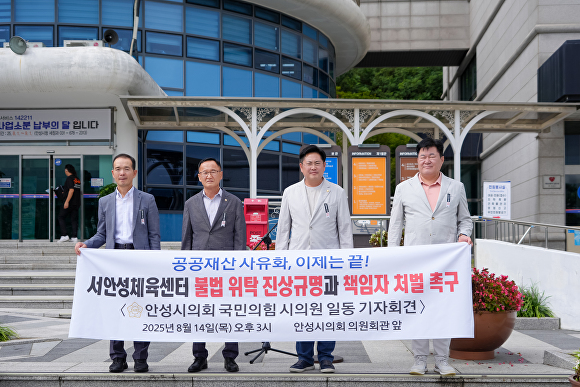 [아이뉴스24 임정규 기자] 경기도 안성시의회 국민의힘 의원들이 14일 서안성체육센터 위탁운영에 대한 감사원 감사 결과 발표와 관련해 최고 책임자에 대한 문책을 촉구하고 나섰다.