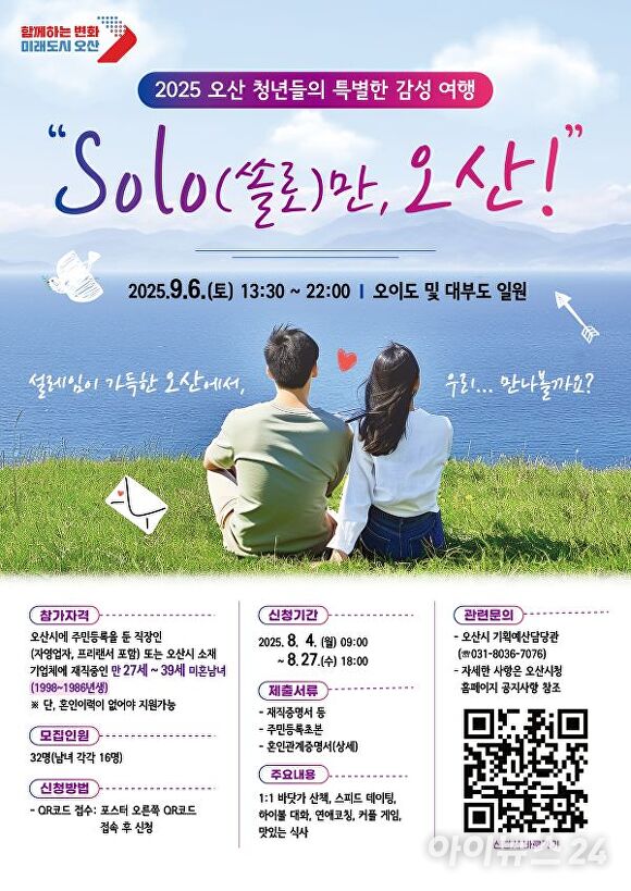 [아이뉴스24 김장중 기자] 경기도 오산시가 주최하는 미혼남녀 만남 행사 ‘SOLO만 오산’ 1회차 참가자를 공개 모집한다.