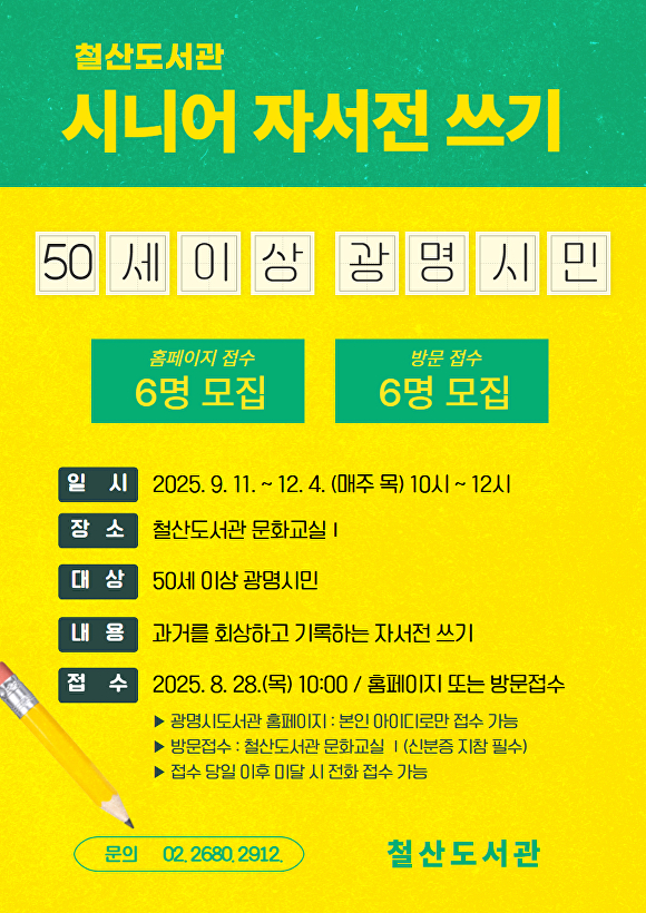 [아이뉴스24 정재수 기자] 경기도 광명시는 오는 28일부터 시니어 세대의 활력 증진과 사회 참여를 돕기 위해 ‘자서전 쓰기 강좌’ 참가자를 모집한다고 25일 밝혔다.