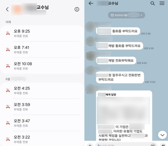 A교수는 신고 당일 B씨에게 늦은 시간에도 여러 차례 전화를 걸었으나 받지 않자 사회관계망서비스(SNS)로 계속 연락을 시도했다.