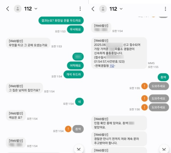 B씨는 "(A교수가) 화장실 문을 두드려요. 무서워요. 계석(속) 두드려"라며 빠른 출동을 요구했다. 이후 세 차례나 "도와주세요"라고 했지만, 외딴 주택이어서 그런지 이 문자메시지는 경찰에게 닿지 않았다.