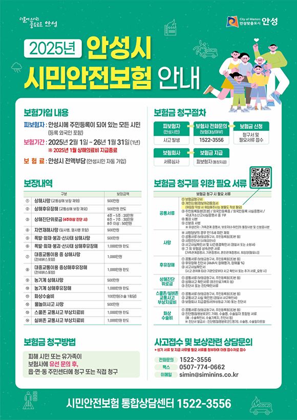 [아이뉴스24 임정규 기자] 경기도 안성시는 예기치 못한 사고로 피해를 입은 시민들의 생활안정과 복지 향상에 기여하기 위해 ‘2025년 안성시 시민안전보험’을 지속 운영한다고 4일 밝혔다.