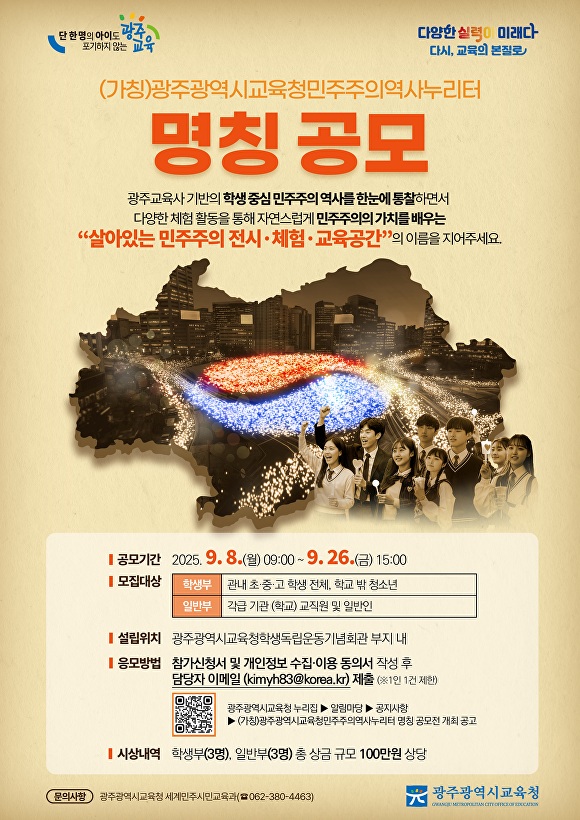 [아이뉴스24 한봉수 기자] 광주광역시교육청이 새롭게 건립하고 있는 민주주의 전시·체험공간 ‘(가칭)광주광역시교육청민주주의역사누리터(이하 역사누리터)’의 명칭을 공모한다.