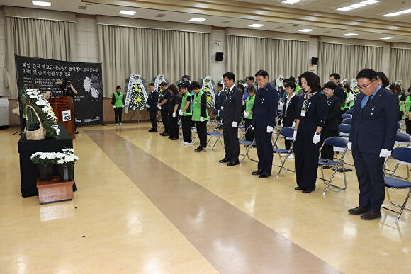 이날 충북교육청 화합관에서 열린 추모식에는 김미경 전국교육공무직본부 충북지부장을 비롯해 윤건영 충북교육감, 이광희 더불어민주당 국회의원(충북 청주서원), 공무직 조합원, 교직원 등 관계자 100여 명이 참석한 가운데 헌화, 분향, 추모사 낭독 순으로 진행됐다.