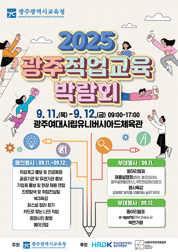 [아이뉴스24 한봉수 기자] 광주광역시교육청은 오는 11~12일 광주여자대학교 시립유니버시아드체육관에서 중·고등학생 5천여명이 참여한 가운데 ‘2025 광주 직업교육박람회’를 개최한다.