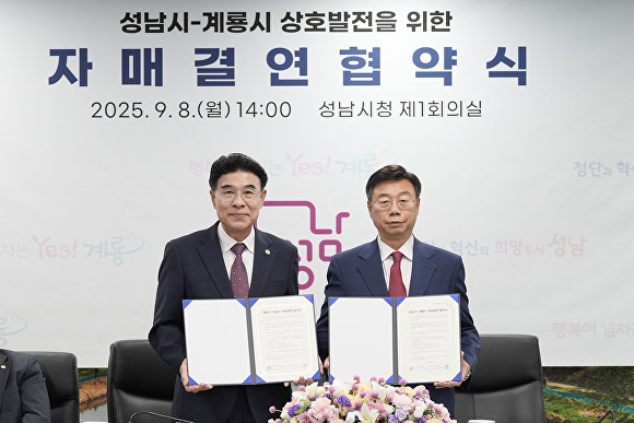 [아이뉴스24 정재수 기자] 경기도 성남시는 8일 충청남도 계룡시와 우호·교류 증진과 동반 성장을 위한 자매결연 협약을 체결했다.
