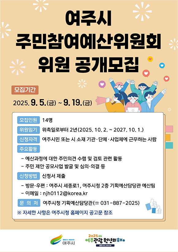 선정 결과는 9월 말 시 홈페이지를 통해 발표될 예정이며, 자세한 문의는 여주시청 예산팀으로 하면 된다.