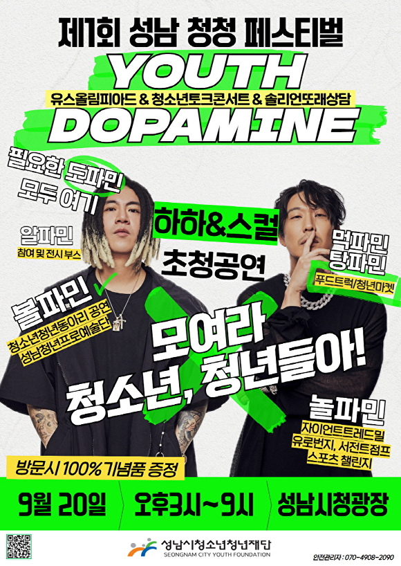 ‘Youth Dopamine’ 부제를 갖고 진행되는 이번 축제는 청소년·청년 정책을 공유하는 ‘성남 Youth Info’, 성남청년프로예술단과 동아리 공연이 펼쳐지는 ‘문화존’, ‘청년마켓’, ‘푸드존’, 명사와 함께 관심사와 고민을 나누는 ‘토크 콘서트’, 로봇코딩과 장애물 경기로 구성된 ‘유스올림피아드’, 신체활동과 체험을 통해 스트레스를 해소할 수 있는 ‘도파민 스테이션’ 등 다양한 프로그램으로 꾸며진다.