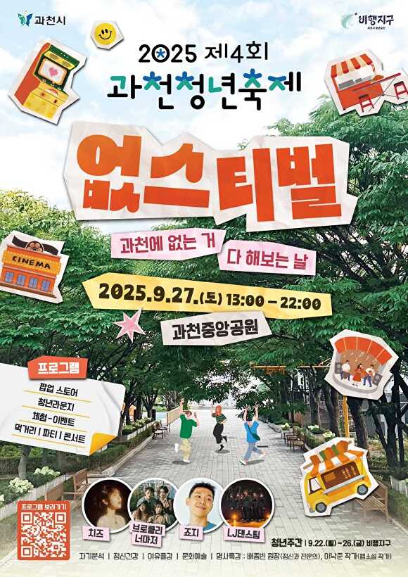 [아이뉴스24 이윤 기자] 경기도 과천시가 청년의 날을 기념해 오는 27일 중앙공원 일대에서 ‘2025년 제4회 과천청년축제-없스티벌’을 개최한다.