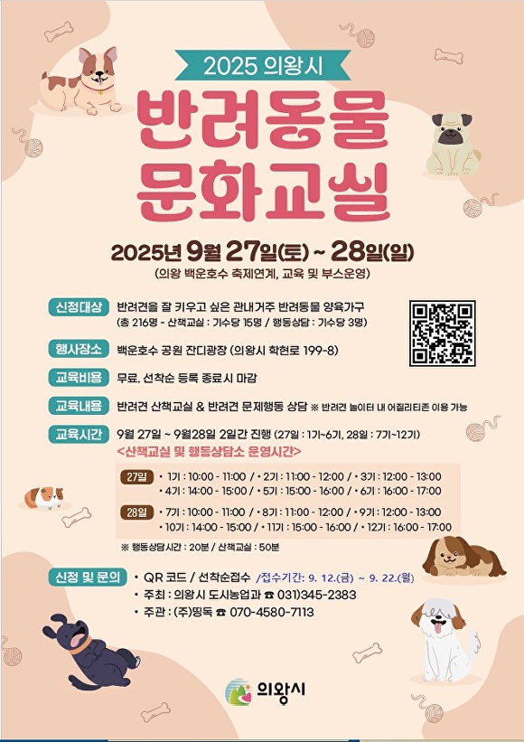 [아이뉴스24 김정수 기자] 경기도 의왕시는 오는 27일부터 이틀간 백운호수공원에서 '2025 하반기 반려동물 문화교실'을 운영한다.