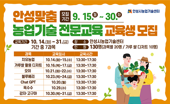 [아이뉴스24 임정규 기자] 경기도 안성시농업기술센터는 오는 30일까지 안성맞춤 농업기술 전문교육 교육생을 모집한다고 15일 밝혔다.