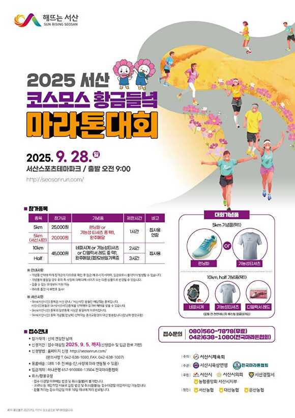 [아이뉴스24 정다운 기자] 충남 서산시가 오는 28일 양대동 서산스포츠테마파크 일원에서 ‘코스모스 황금들녘 마라톤대회’를 연다. 올해는 전국에서 7000여명이 참가해 지난해(3500여명)보다 두 배 이상 늘었다.