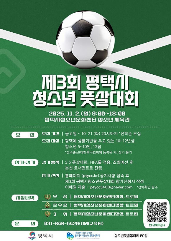 참가 문의 및 풋살대회 관련 자세한 내용은 평택시청소년문화센터 누리집 또는 미래교육팀으로 하면 된다.