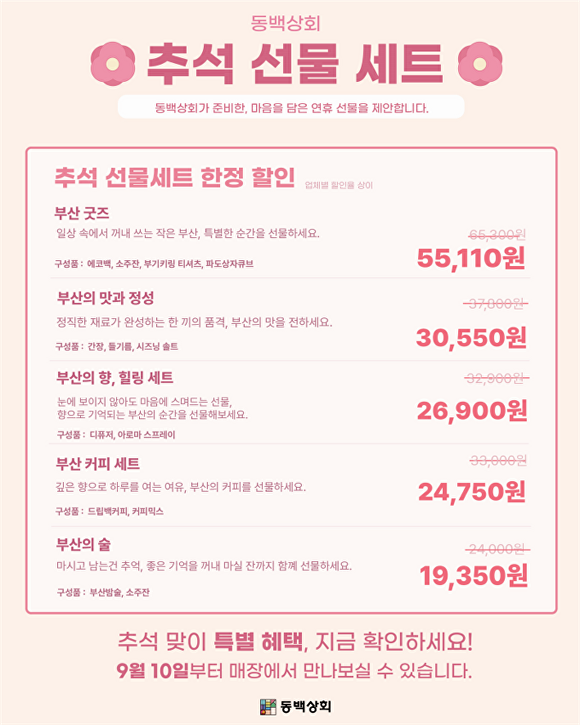 [아이뉴스24 정예진 기자] 부산광역시가 부산 우수 제품 쇼핑 숍 ‘동백상회’에서 추석 명절을 앞두고 지역기업 제품으로 구성된 ‘선물세트’를 출시해 오는 30일까지 특별 할인 행사를 한다.