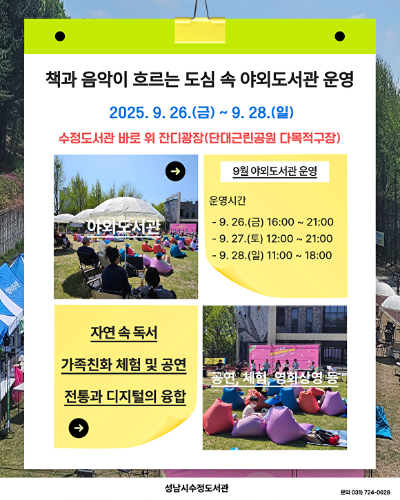 야외도서관은 우천 시 실내 행사로 전환되며 세부 일정은 수정도서관 홈페이지(www.snlib.go.kr/sj/) 및 SNS를 통해 확인할 수 있다.