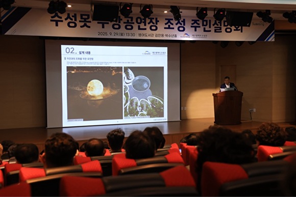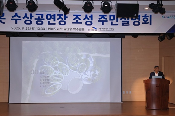 [아이뉴스24 이창재 기자] 대구 수성구(구청장 김대권)는 29일 범어도서관 김만용·박수년홀에서 ‘수성못 수상공연장 조성 주민설명회’를 열고 사업 추진 현황과 향후 계획을 공유했다.