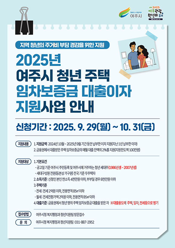 [아이뉴스24 임정규 기자] 경기도 여주시는 다음 달 31일까지 ‘2025년 청년 주택 임차보증금 대출이자 지원사업’ 신청자를 모집한다고 29일 밝혔다.
