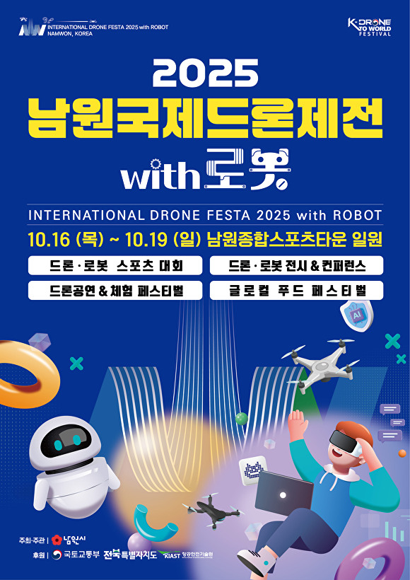 남원시와 국토교통부가 주최하고 전북특별자치도, 항공안전기술원이 후원하는 「2025 남원국제드론제전 with 로봇」은 오는 16일부터 19일까지 4일간 남원종합스포츠타운 일원에서 성대하게 펼쳐진다.