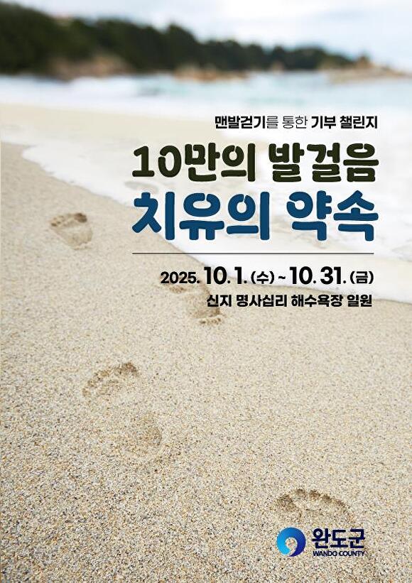 군은 해양치유센터 이용객 10만 명과 해양기후·문화, 맨발 걷기 등 누적 치유객 50만 명 달성을 기념해 오는 10월 1일부터 31일까지 한 달간 신지 명사십리 해수욕장 일원에서 ‘해양치유 맨발 걷기 나눔 챌린지’를 진행한다고 26일 전했다.
